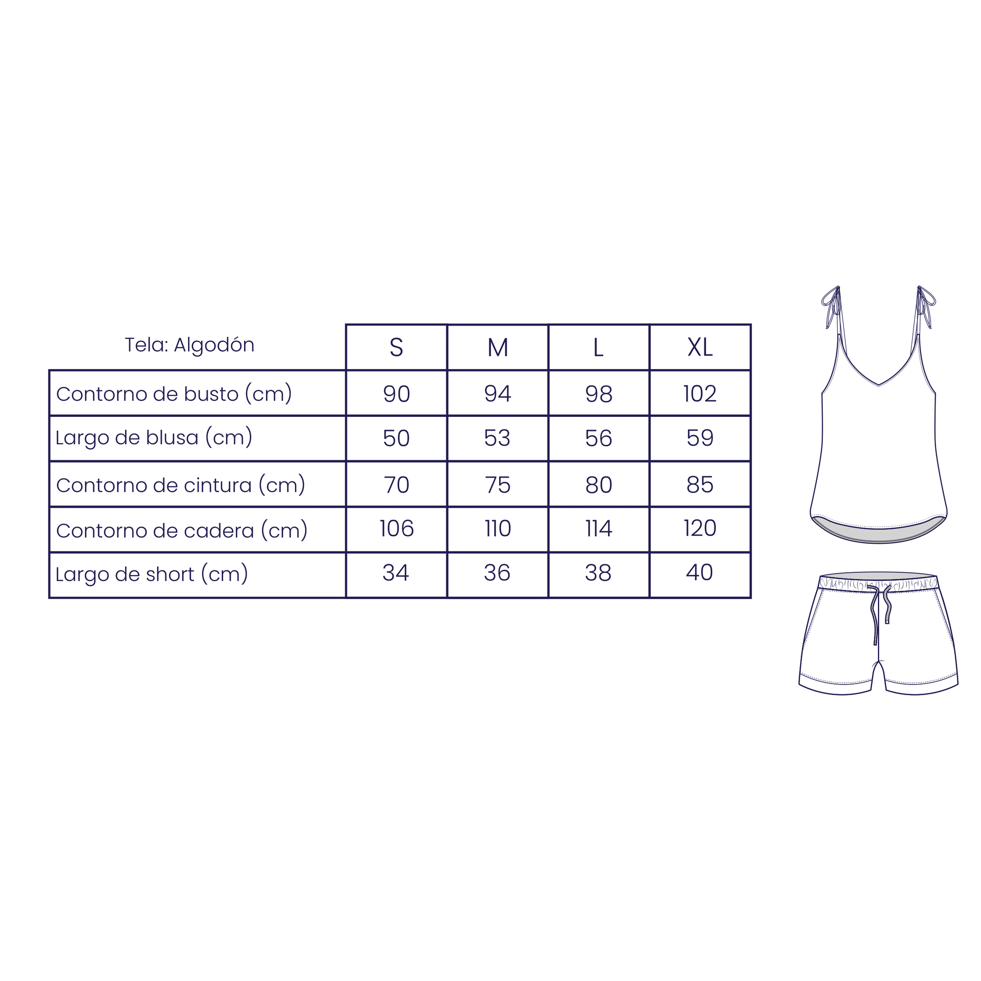 - Short: con bolsillos, cintura elástica y cinta ajustable.