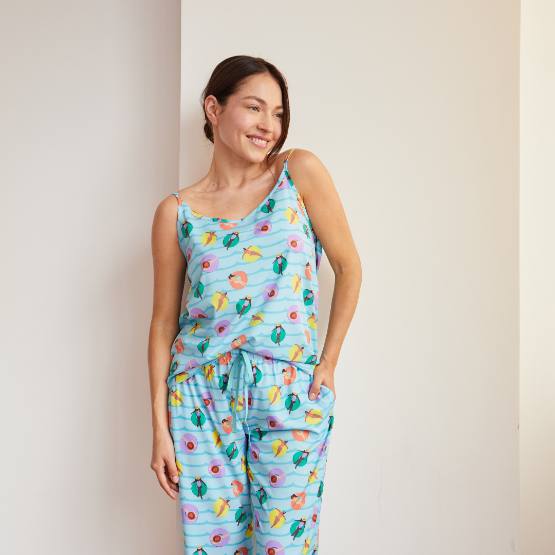 Nuestra pijama Aqua ha sido diseñada para que disfrutes la comodidad al máximo, combinando un estampado exclusivo con una suavidad incomparable. Es ligera, fresca y perfecta para dormir cómoda y feliz!
